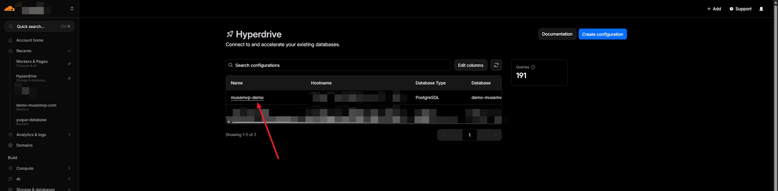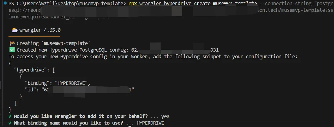 npx wrangler hyperdrive create musemvp-demo --connection-string="postgresql://neondb_username:npg_password@ep-xxx-bush-xxxx-pooler.ap-xxx-1.xxx.neon.tech/demo-musemvp-com?sslmode=require&channel_binding=require"