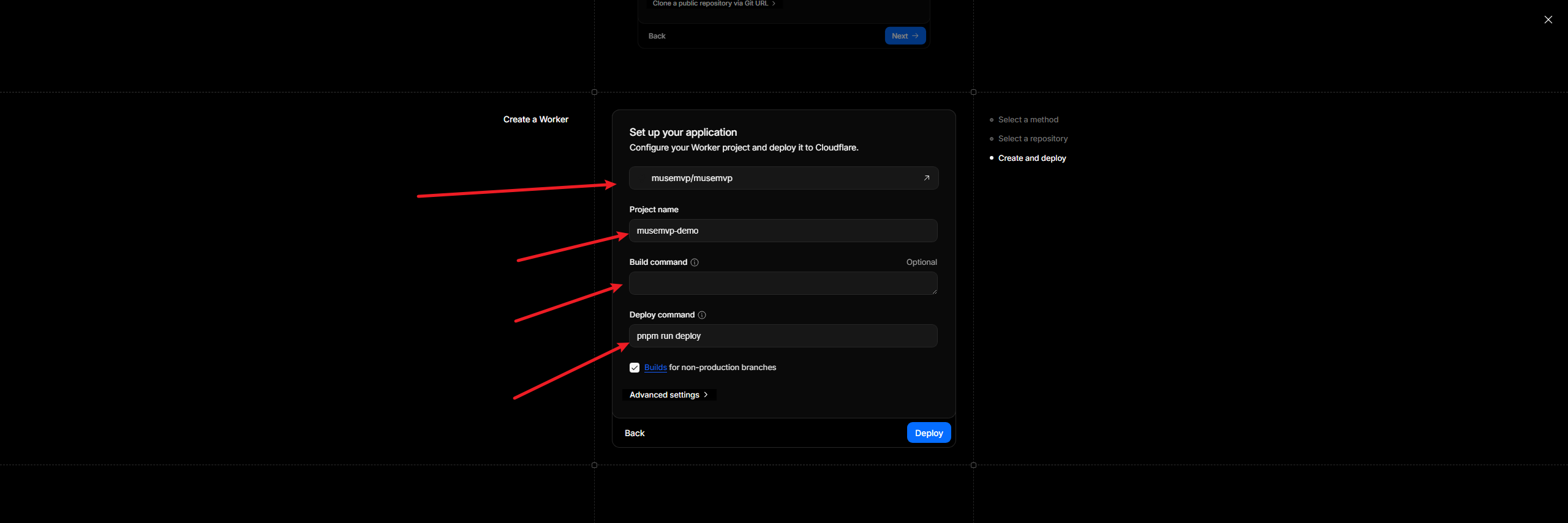 In your wrangler.jsonc file, set the name field to your desired Worker name (e.g. musemvp-demo):