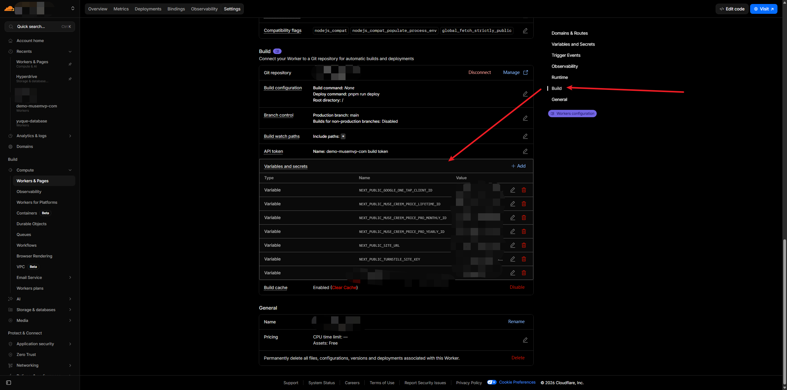 • Cloudflare Worker requires a paid plan at $5/month (Workers Paid). The free plan limits bundle size to 3MB (Limits · Cloudflare Workers docs), while the MuseMVP build output is typically 3MB–4MB, which exceeds the free plan limit.