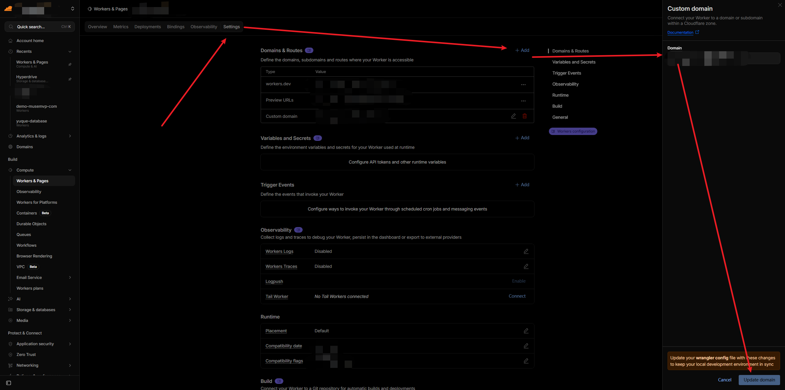 In the Cloudflare Worker project settings, add and bind your custom domain: