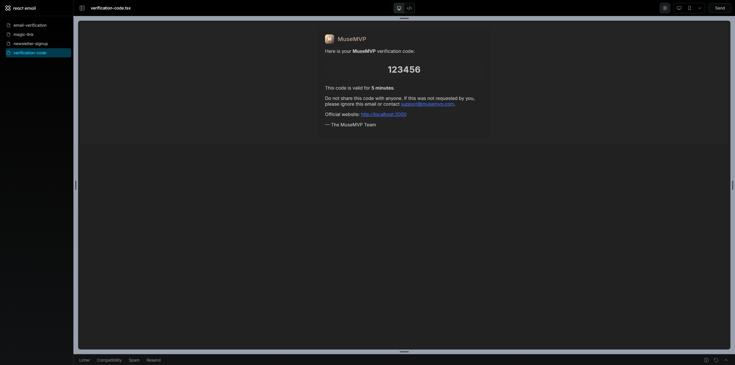 MuseMVP uses Resend to send emails and React Email to render templates. The unified sendEmail() entry supports both template mode and raw mode, with locale-based email subjects.