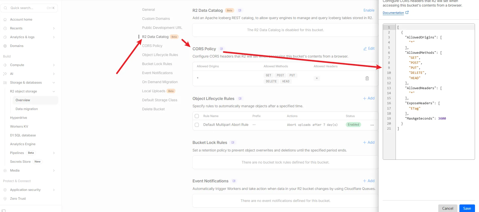 CORS configuration allows the frontend to access your Cloudflare R2 bucket. Adjust it for your actual requirements, especially AllowedOrigins.