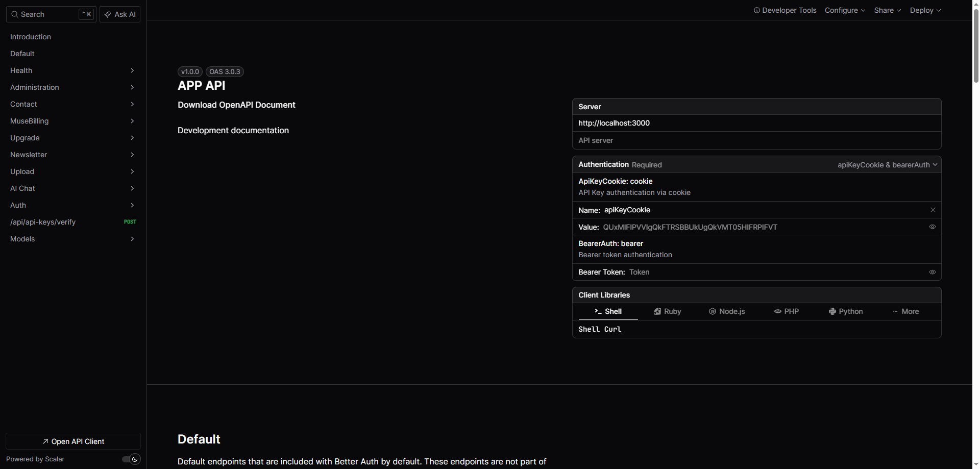 MuseMVP 通过三个仅管理员可访问的端点,提供完整的 API 文档链路。路由使用 hono-openapi 的 describeRoute 和 validator 自动生成 schema,配合 Scalar 渲染可交互的 API 参考界面。