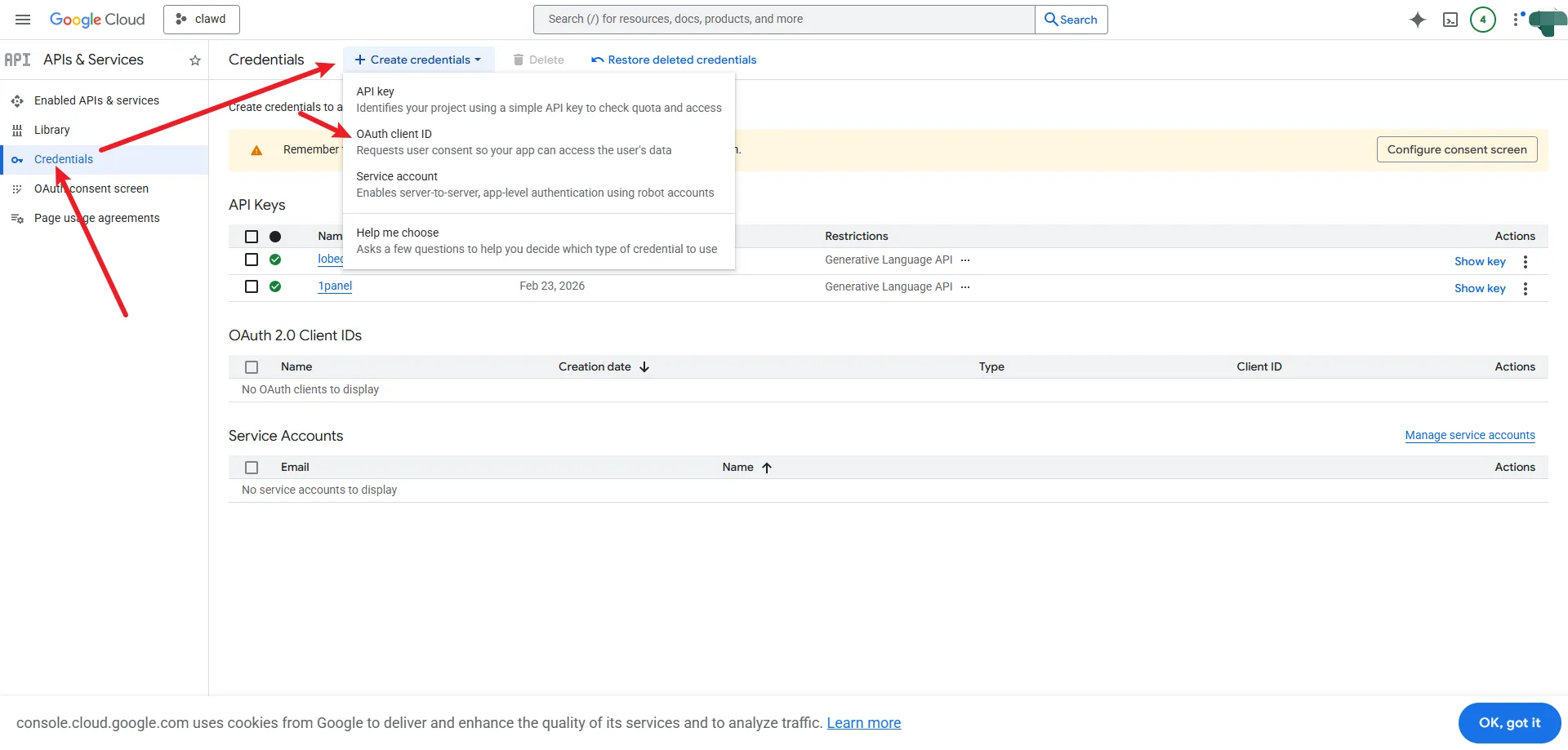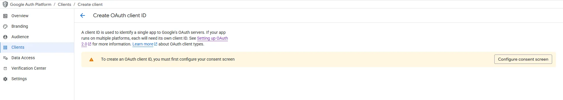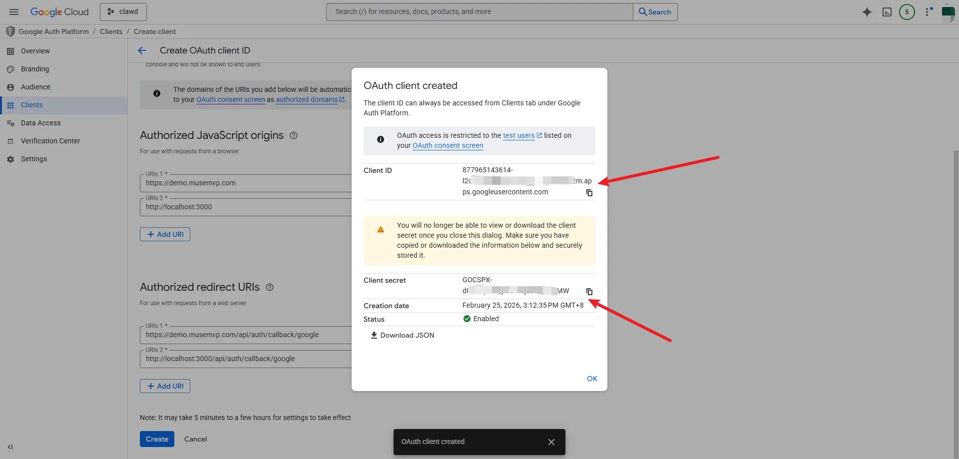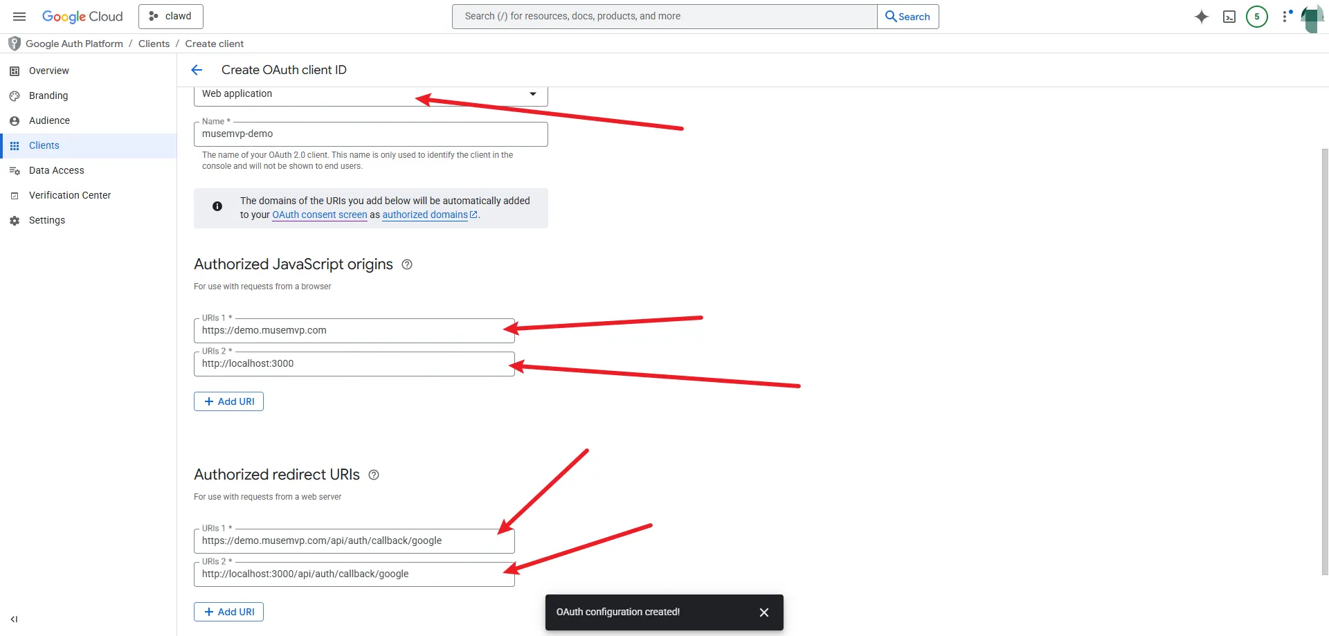 在 APIs & Services → Credentials 创建 OAuth client ID,应用类型选择 Web application,并设置 Authorized redirect URI 为:<your-site-url>/api/auth/callback/google